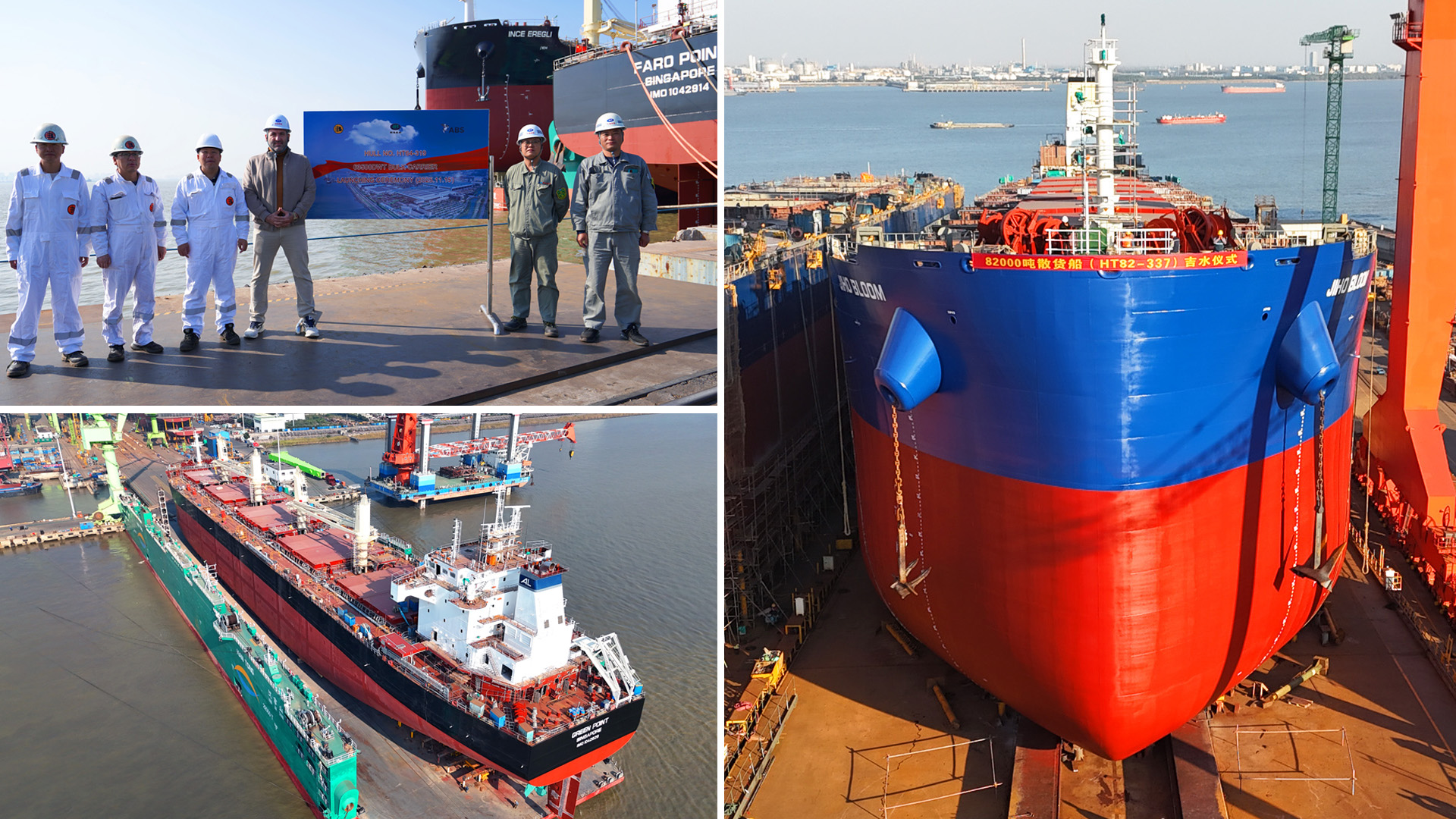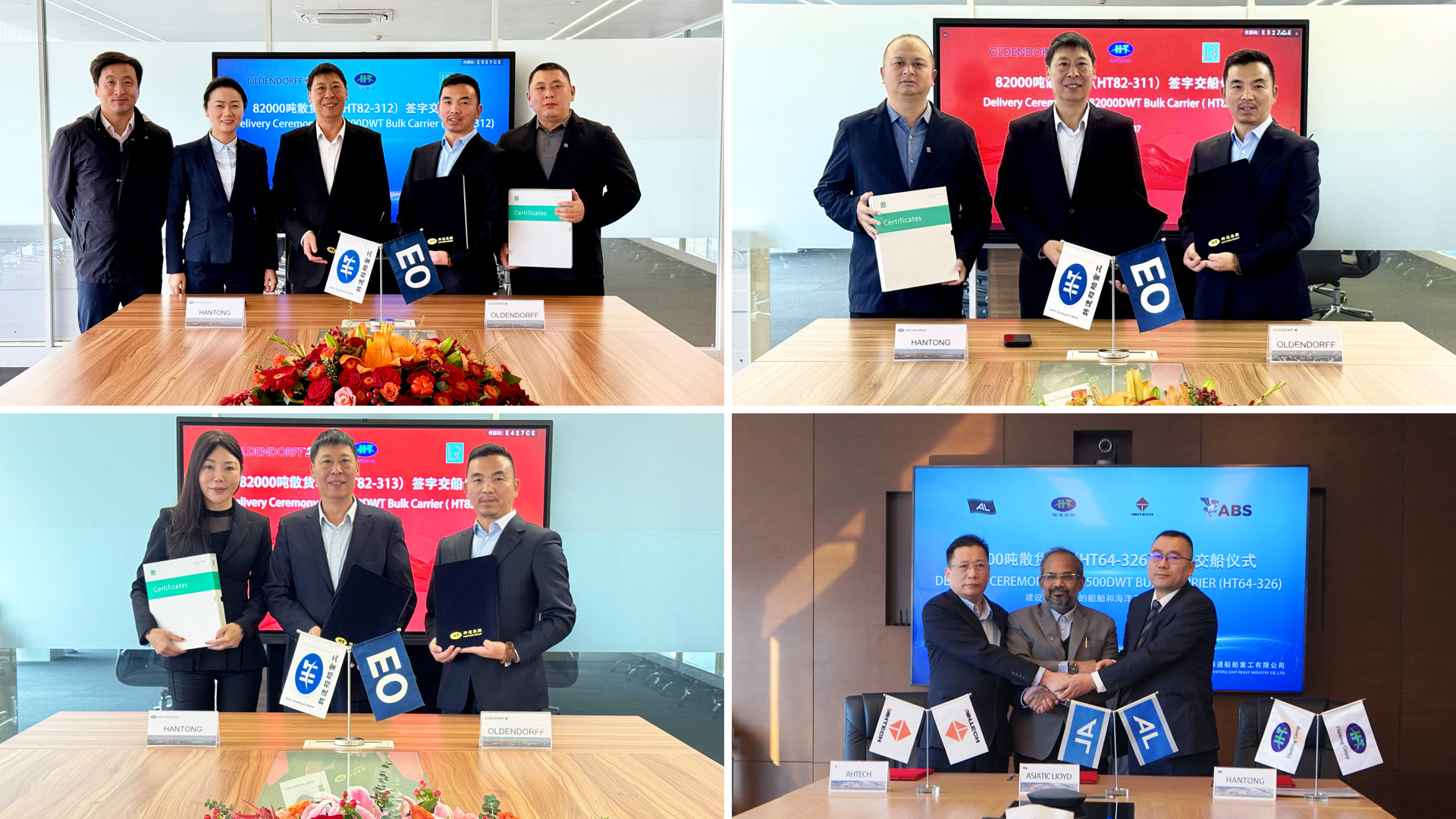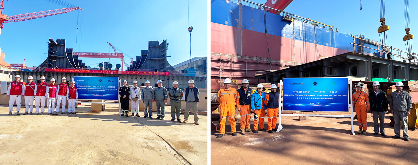开工仪式 开工节点稳步启动,AP的63500吨散货船(HT64-364)、NNC的82000吨散货船(HT82-372)以及OLDENDORFF的82000吨散货船(HT82-380)相继开工,标志着这些项目进入建造实施阶段。 重大节点捷报频传 上台节点有序推进,生产节奏持续提速。Trafigura项目HT-OT319-374与OLDENDORFF项目HT82-377分别于11月18日、11月20日顺利完成上台,以高效的施工组织保障了生产流程的顺畅衔接。 下水任务圆满完成,建造进程稳步向前。AL的HT64-328船舶与IBULK的HT64-319船舶先后于11月3日、11月15日顺利下水;KCH的HT82-337船舶,也于11月19日成功下水。多艘船舶顺利下水意味着其建造工作进入关键收尾阶段,为后续交付工作创造了有利条件。 11月份4艘船舶圆满交付 OLDENDORFF项目HT82-312、HT82-311、HT82-313以及AL项目HT64-326,分别于11月6日、11月7日、11月17日、11月20日按期交付,凭借优良的建造质量和高效的交付流程,赢得了船东的高度认可,进一步巩固了集团与客户之间的长期合作关系。 海上风电H9生活平台发运 2025年11月28日由我司建造的三峡大丰H9升压站辅助平台顺利发运接载,该辅助平台的顺利接载标志着我司承接的三峡大丰800MW升压站项目全部安全交付。 三峡大丰800MW风电项目总装机容量800兆瓦,包含H8-1#、H9#、H15#、H17#四个场址,场址区域水深9-18米,配套建设2座20万千瓦和1座40万千瓦海上升压站以及一座升压站辅助平台 。H8-1#场址中心离岸80千米,最远点离岸85.5千米,是我国当前离岸最远的商业化海上风电项目。 市场开拓喜讯频传 我司在11月内接连与来自日本、德国、英国等知名船东签署多项新造船合同,业务范围覆盖四大主力船型:82,000DWT散货船、211,000DWT散货船、4500TEU集装箱船以及319,000DWT超大型原油运输船,共计19艘,船型订单大型化显现。充分彰显了我司在全球造船市场强劲的竞争力。这些新签订单将于2028年及2029年交付。 韩通船舶密集斩获了包括确定订单和选择权订单在内的多笔大单,涵盖了大型散货轮、集装箱船、大型原油轮等主力船型。这一系列成就不仅反映了全球航运市场对新造船需求的持续升温,更凸显了韩通船舶重工在船舶设计、建造质量和交付周期等方面的综合实力获得了国际主流船东的广泛信赖。
