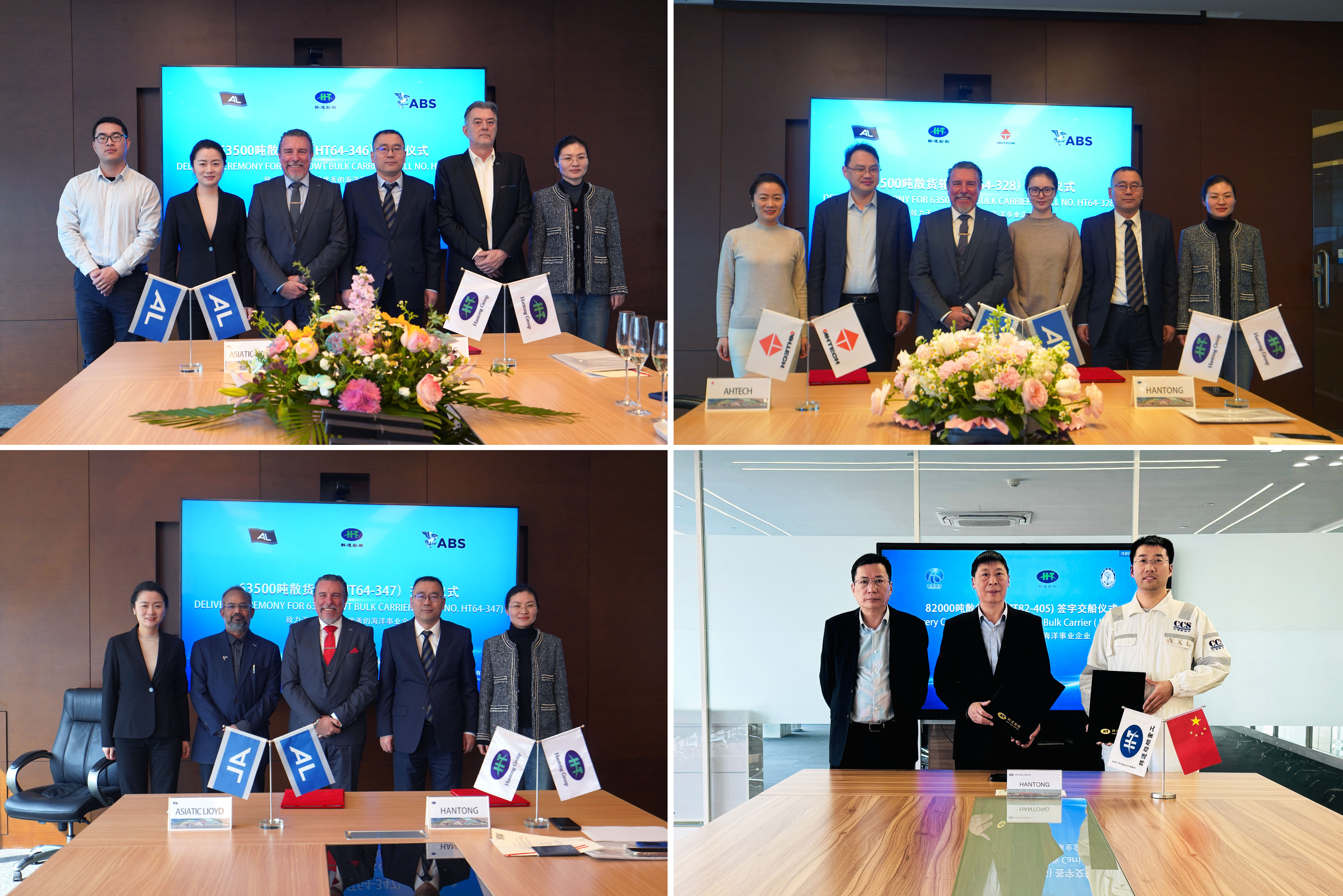交付节点成果显著 本月,AL项目HT64-346、HT64-328、HT64-347分别于2月5日、2月10日、2月12日顺利交付。民生租赁项目HT82-405于2月5日按期交付。多艘船舶的高质量交付,进一步巩固了集团与核心客户的长期战略合作关系。 开工仪式 开工节点稳步启动,新项目有序推进。HT-OT159-361于2月2日正式开工。HT82-415、HT82-416于2月26日相继开工。VLCC(HT-OT319-466)于2月27日顺利开工。系列新船开工,为后续生产注入持续动能。 2月各项生产节点的顺利达成,是全体员工凝心聚力、攻坚克难的成果。接下来,韩通船舶将继续强化质量过程管控,全力推动全年生产目标高质量完成。 2月份新签订单9艘 我司在2月内接连斩获新造船大单,先后与多家知名船东签署多项建造合同。此次签约涵盖了散货轮64k、210k及VLCC共计9艘新造船。